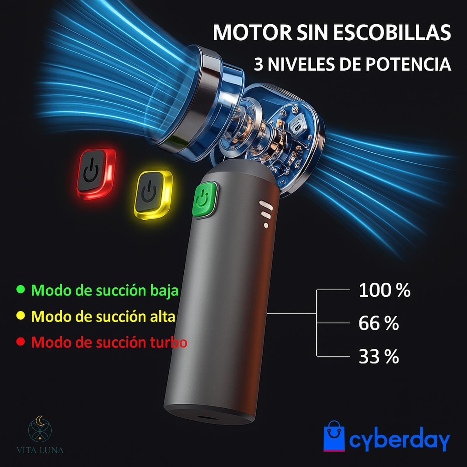 Potencia compacta que simplifica tu limpieza diaria: succión intensa, diseño liviano y total libertad sin cables. Con 3 modos y filtro lavable, limpia del auto al sofá en minutos.